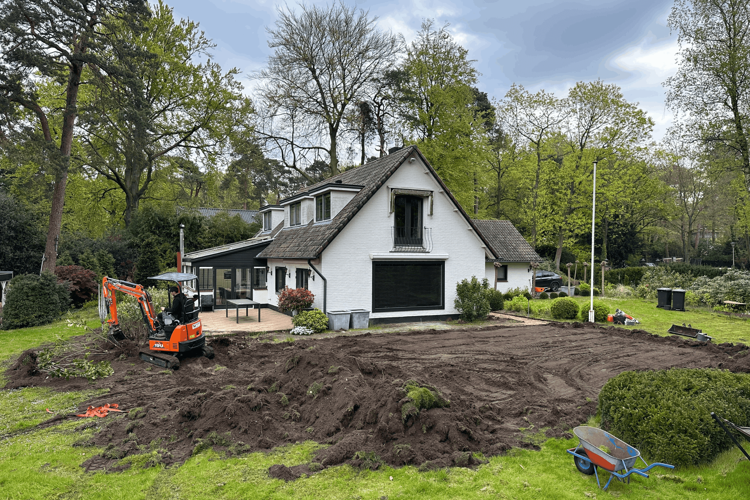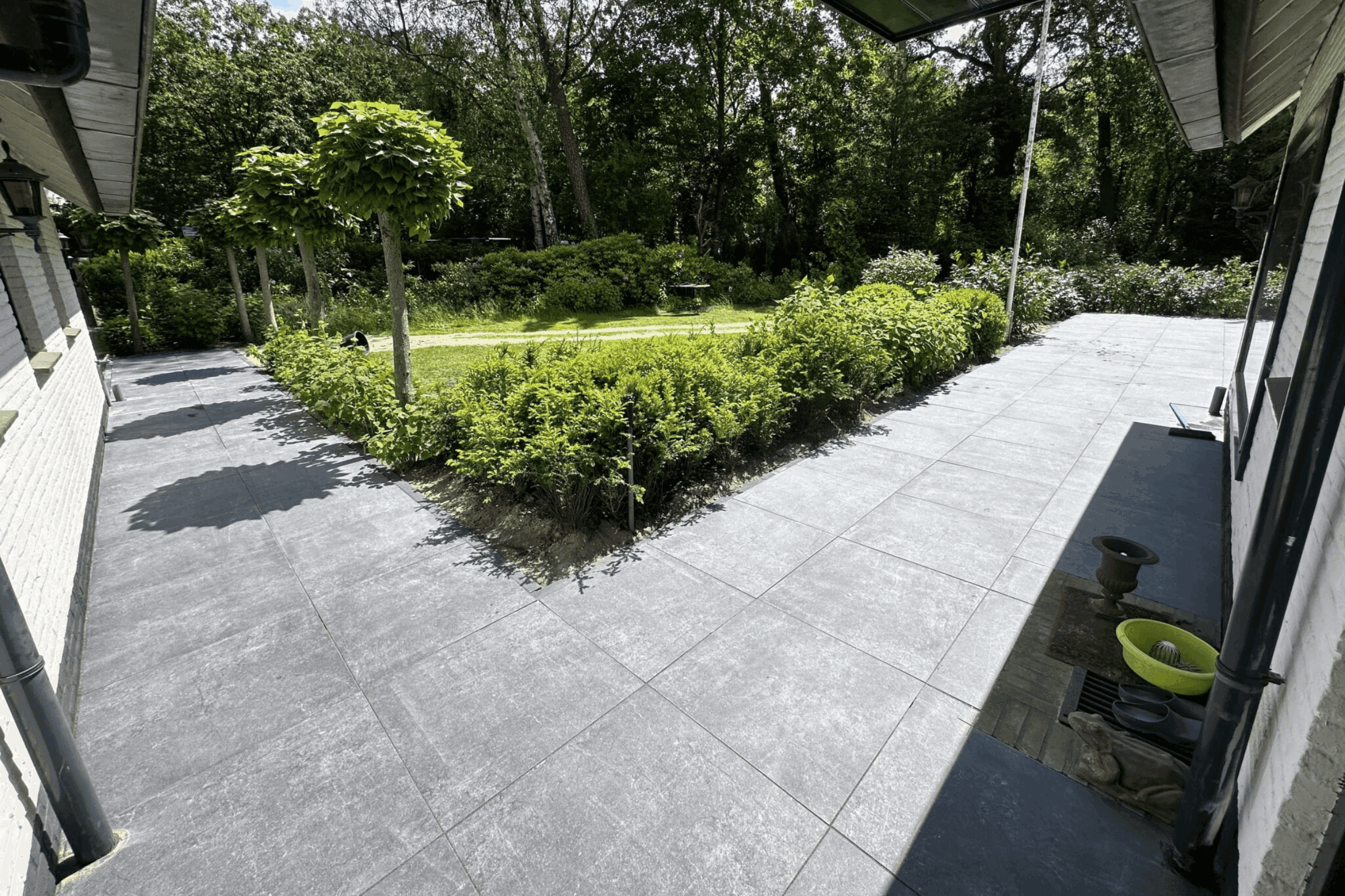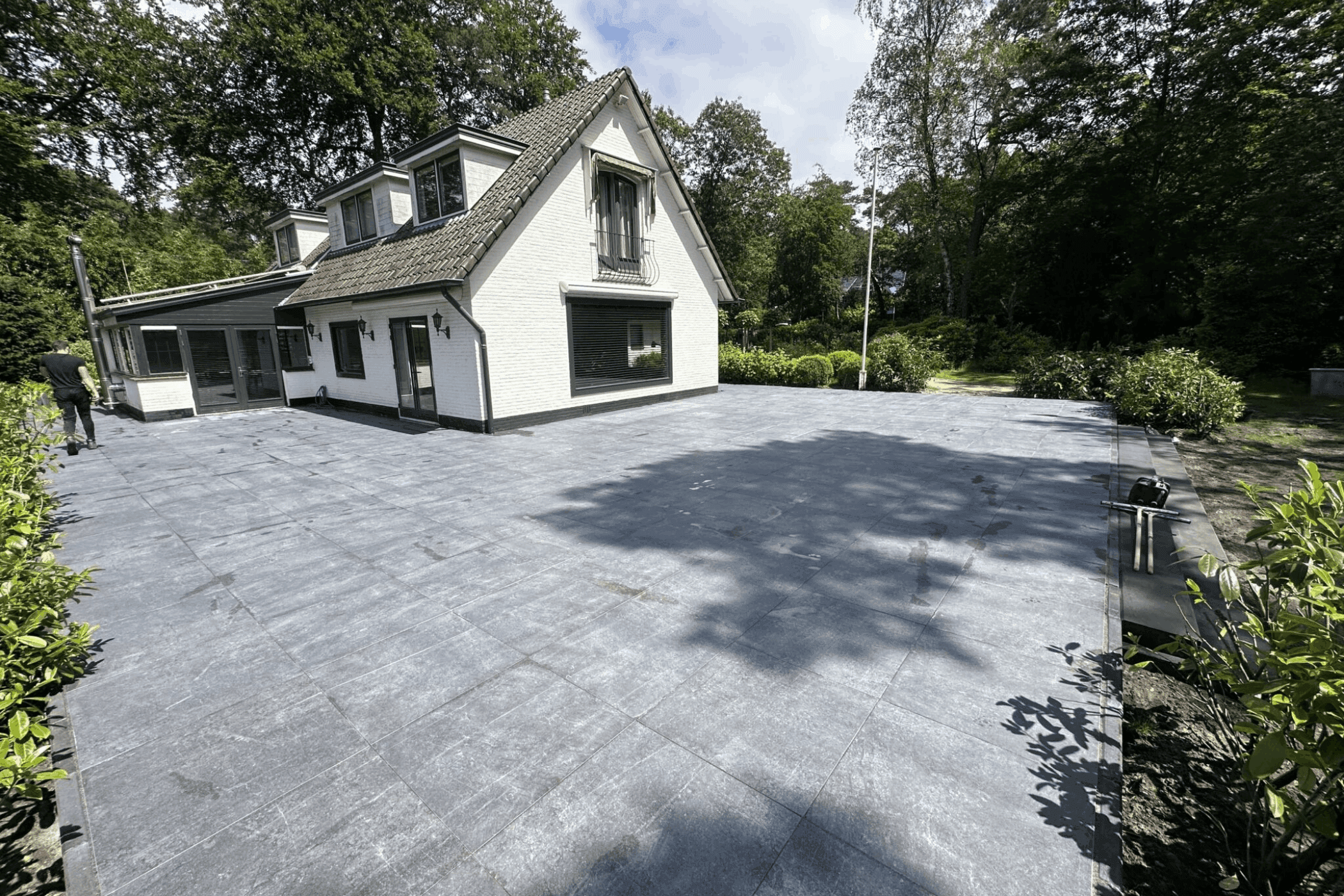 Voor deze prachtige villa in Blaricum hebben we rondom het huis een luxe terras aangelegd met 80x80 keramische tegels. Het strakke patroon en de hoogwaardige afwerking sluiten naadloos aan bij de moderne uitstraling van de villa. Dankzij de precieze plaatsing en duurzame materialen is dit terras niet alleen een stijlvolle eyecatcher, maar ook een functionele, comfortabele uitbreiding van de leefruimte.