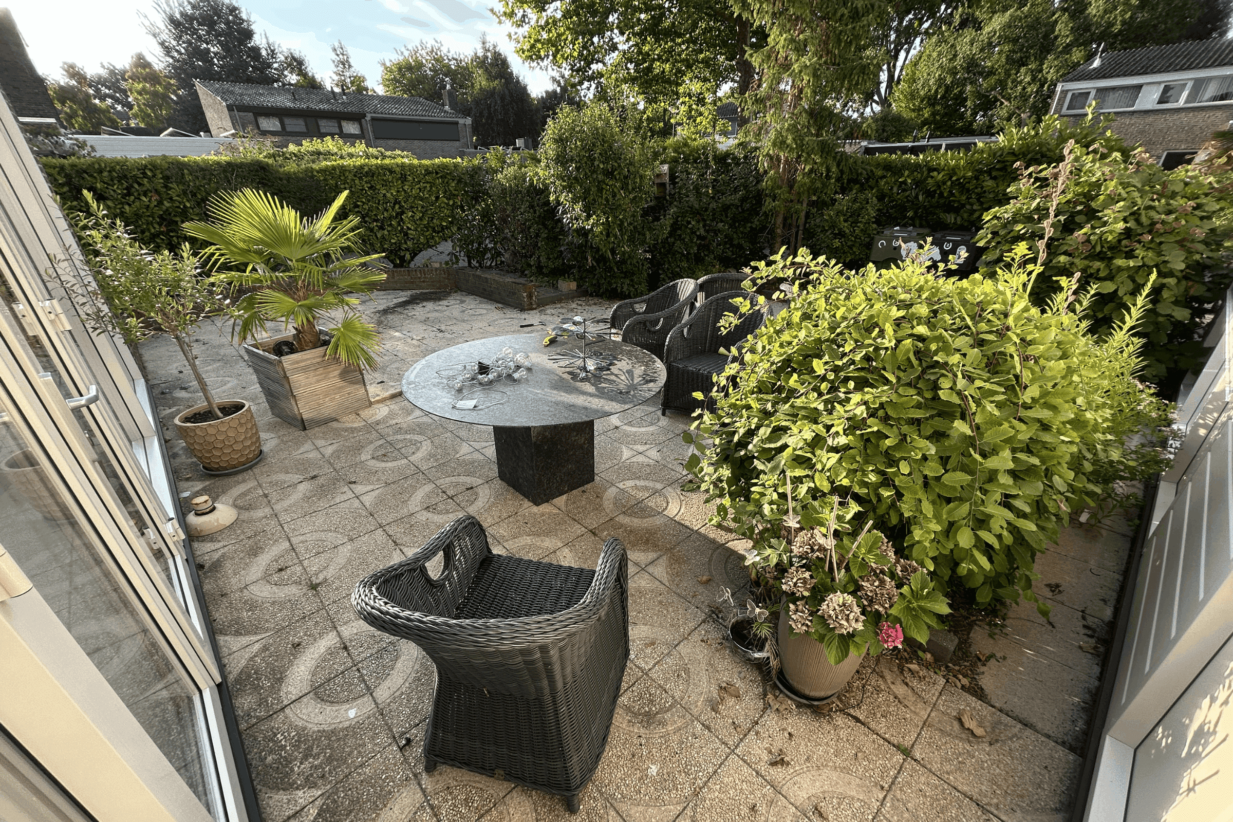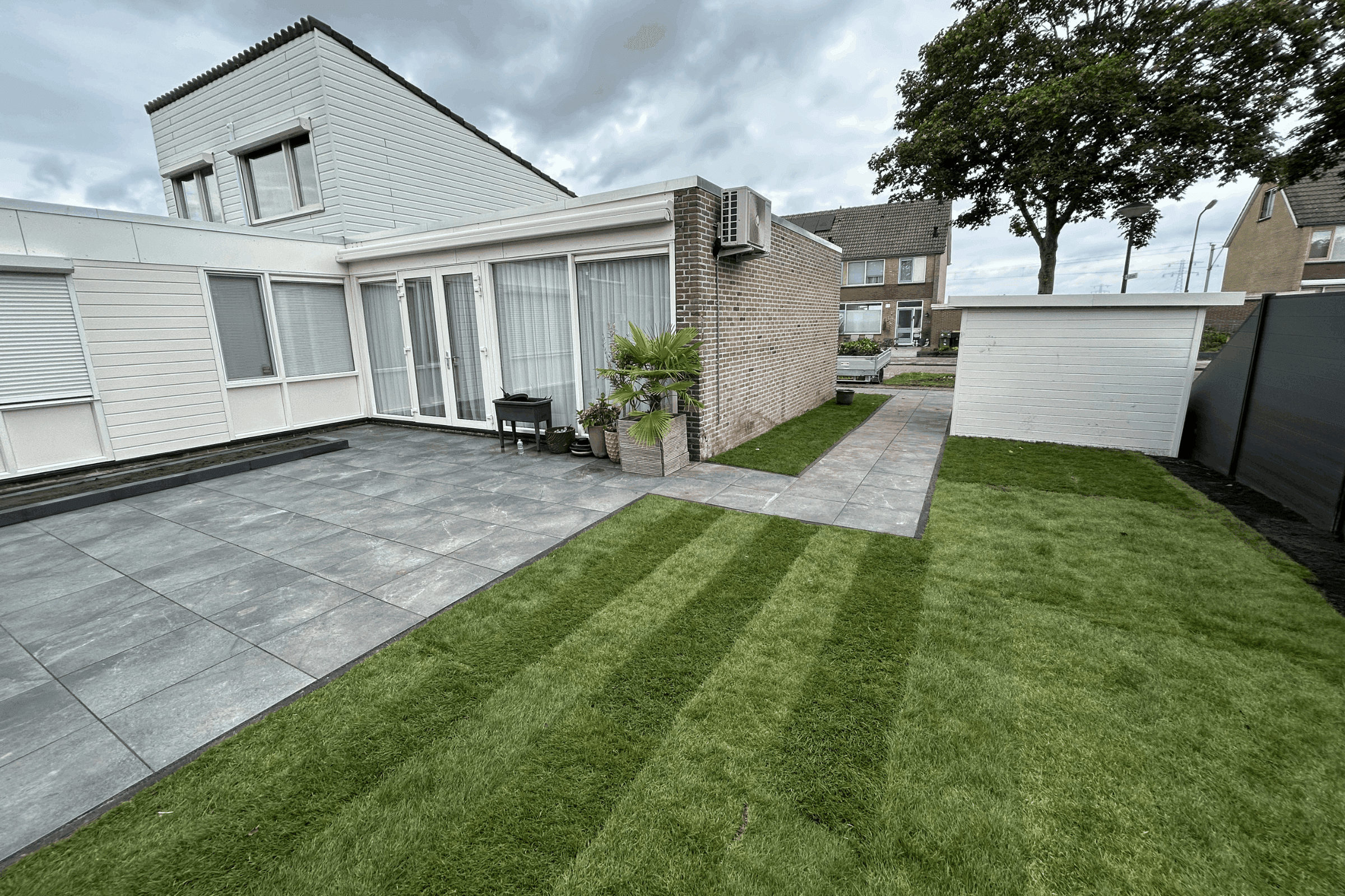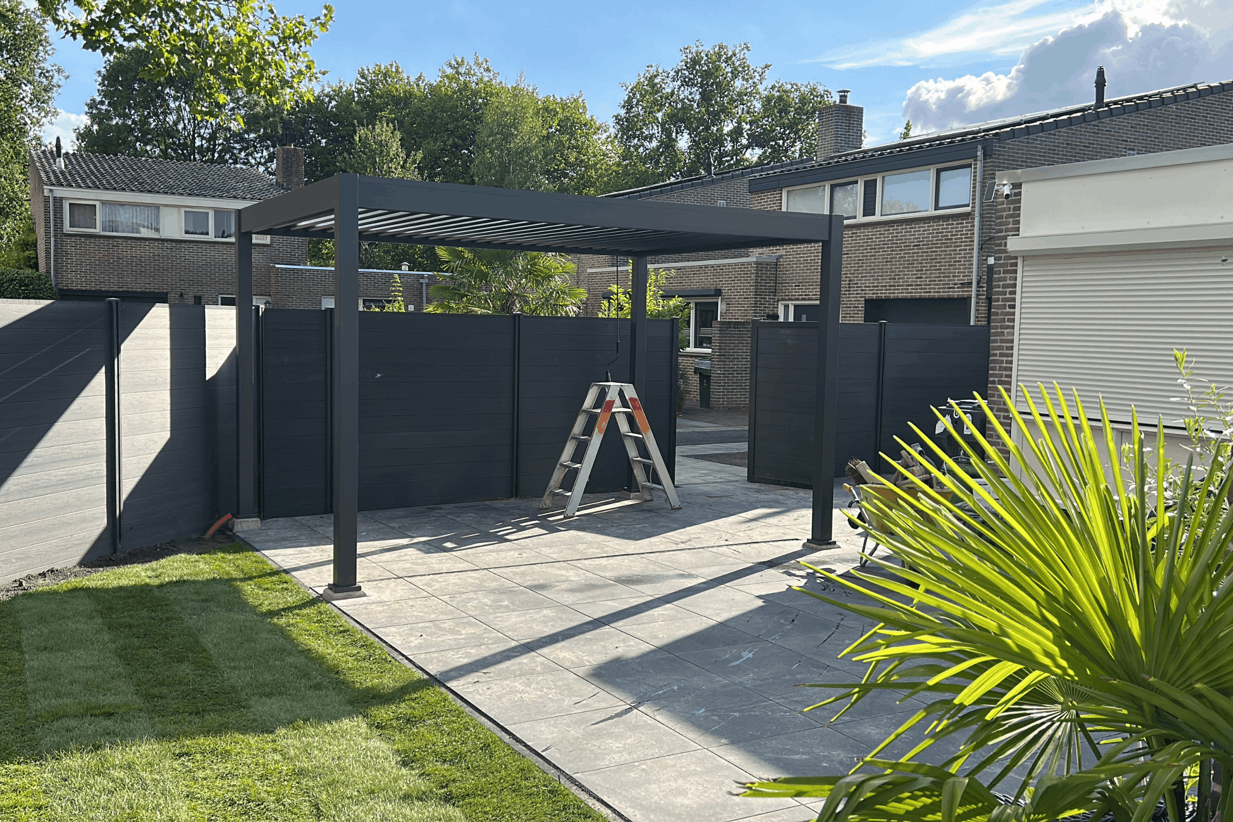 Deze moderne tuin is volledig vernieuwd met een strakke en eigentijdse uitstraling. De nieuwe bestrating met 60x60 tegels zorgt voor een rustige basis en een ruimtelijk effect. In combinatie met de moderne schutting en stijlvolle overkapping ontstaat er een harmonieus geheel waarin comfort en design samenkomen. De tuin is niet alleen praktisch ingericht, maar vormt ook een sfeervolle plek om het hele jaar door van te genieten.